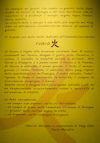 A los colores contenidos en el fuego, por tanto el amarillo sol, el naranja, el rojo, el violeta en tonalidades vivas y brillantes. A las formas en triángulo y en punta con el fuego y las llamas. Al fuego se asocia el pleno día, el sol, el mediodía, el calor, el verano, el máximo del yang, el ápice de la manifestación de la energía, el Padre celestial, la inteligencia, la fama, el éxito, la velocidad, la sangre, la circulación sanguínea, el corazón. Por consiguiente, esta Suite está especialmente indicada para quien tiene un temperamento excesivamente tranquilo y necesita una inyección de vitalidad.